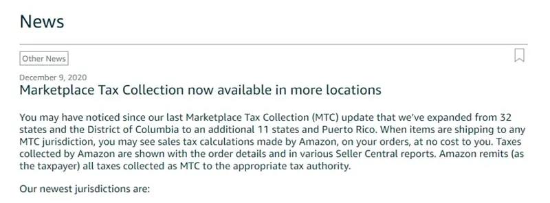 近日,亞馬遜美國發(fā)布了關(guān)于更多地區(qū)商城收稅的公告,新增了11個(gè)亞馬遜需要代收代繳銷售稅的地區(qū)。
