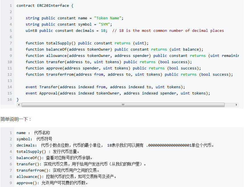這里也介紹一下ERC20,這是以太坊定義的令牌標(biāo)準(zhǔn)。這個(gè)標(biāo)準(zhǔn)要求我們?cè)趯?shí)現(xiàn)代幣時(shí)必須遵守約定。只有支持協(xié)議,才能得到以太坊錢包的支持。下面是協(xié)議代碼界面??床欢矝](méi)關(guān)系。程序員就能搞定。
